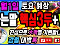 [1월7일 금요결과] 금)제주1 3금산 - 9용병여신 8.1배 11.8배 (A급승부) 강철 제주1R ★A급 삼파전 4-3한방/9-4,3방어/삼복쌍4-3-9단통 1경주 4하늘미소-8보람이-5정든로 6.1배 삼복11.9배 (삼복) 강철 부산1R ★강공4 4-8한방/4-5방어/삼쌍복4-8,5 제주3 6화산도 - 4성읍강자 4.6배 13.5배 (방어) 강철 제주3R ★강공6 6-1한방/6-10.4방어/삼쌍복6-1,10,4 금)2경주 6주말보배 - 8운주불패 7.9배 5.2배 (A급한방) 강철 부산2R ★A급 삼파전 6-8한방/5-6,8방어/삼복쌍6-8-5단통 금)제주5 7아라으뜸-4햇살언덕-10흑룡부대 삼쌍42.7배 13.8배10.1배 (한방) 강철 제주5R ★강공7 7-4한방/7-10.5방어/삼쌍복7-4,10,5 금)6경주 7청마황후 - 3반지의기적 11.9배 28.8배 (주력한방) 강철 부산6R ★강공7 7-3한방/7-5,8방어/삼쌍복7-3,5,8 금)8경주 4쿨가이 - 10톱메이트 18.2배 13.2배 (끝판마무리) 강철 부산8R ★강공4 4-9한방/4-10,3방어/삼쌍복4-9,10,3 [1월8일 토요결과] 토)3경주 5불화산-8더블테이크-9선더호스 8.0배 15.9배 삼복10배 (배당) 강철 서울3R ★강공8 8-9한방/8-5,2방어/삼쌍복8-9,5,2 [1월9일 일요결과] 일)4경주 10라온더위켄드 - 4리얼콩코드 14.6배 8.9배 (쌍식) 강철 서울4R ★강공10 10-9한방/10-4,8방어/삼쌍복10-9,4,8 일)부산3 6범이내려온다 - 10올드천하 9.8배 4.3배 (A급한방) 강철 부산3R ★A급 삼파전 6-4한방/10-6,4방어/삼복쌍6-4-10단통 일)9경주 2춘산 - 3히든삭스 6.0배 11.4배 (특메인한방) 강철 서울9R ★특메인 강공3 3-2한방/3-13,9방어/삼복쌍3-2-13,9